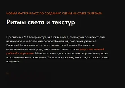 Предыдущий МК покорил сердца тысячи людей, поэтому мы решили создать нечто новое, еще более интересное! Концепция, созданная ученицей Валерией Горностаевой под наставничеством Полины Парцевской, единственная в своем роде, что позволит похвастаться супер качественной работой в портфолио. Мы приготовили для вас нереально вкусные материалы и различные схемы освещения. Записали уроки так, что у каждого из вас точно получится!