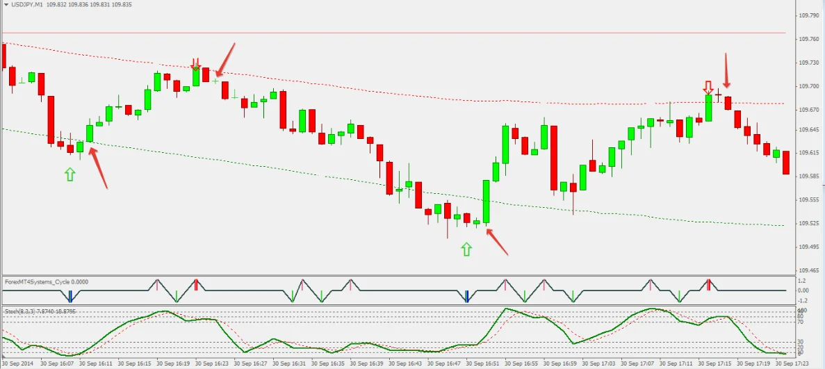 Покупать опцион нужно только на третей свечи после появлении стрелки. Время экспирации 1 минута.