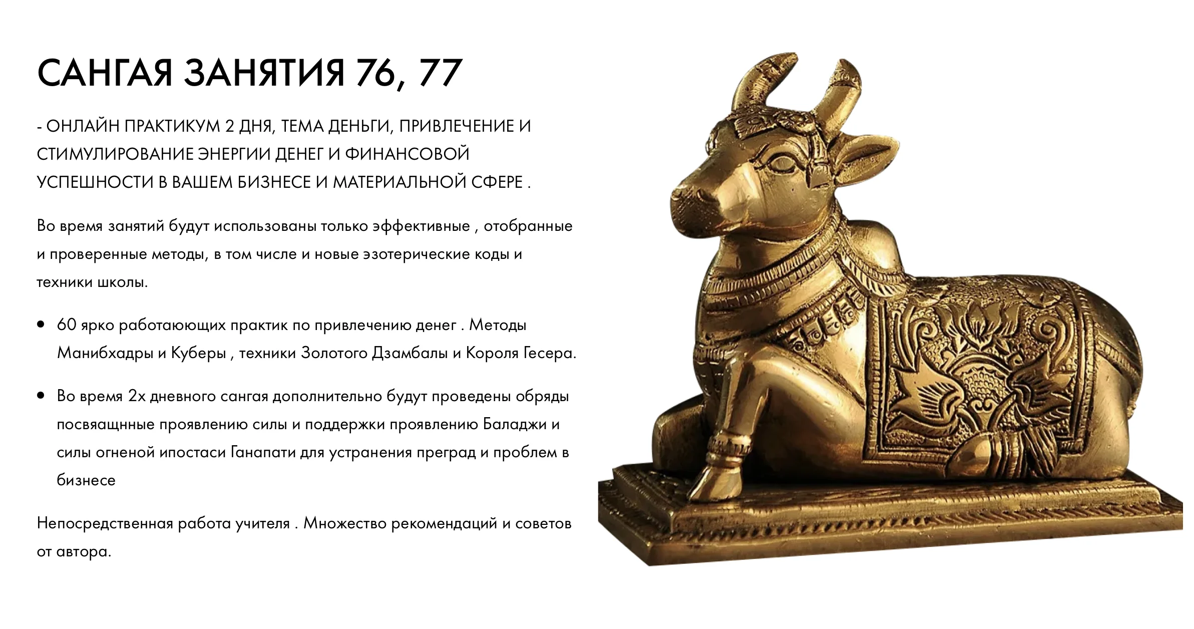 Во время 2х дневного сангая дополнительно будут проведены обряды, посвященные и активации силы и поддержки проявлению Баладжи и силы огненной ипостаси Ганапати для устранения преград и проблем в бизнесе и финансовой успешности.