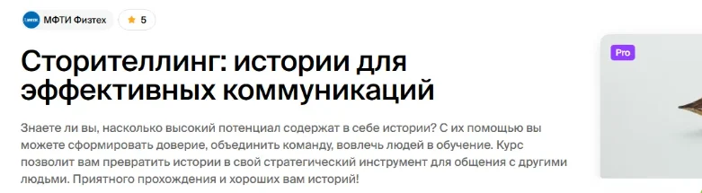 Курс состоит из 12 модулей. В каждом модуле есть видео и тест для самопроверки. В конце курса вас ждут практические рекомендации, как развить привычку рассказывать истории, и итоговый тест.