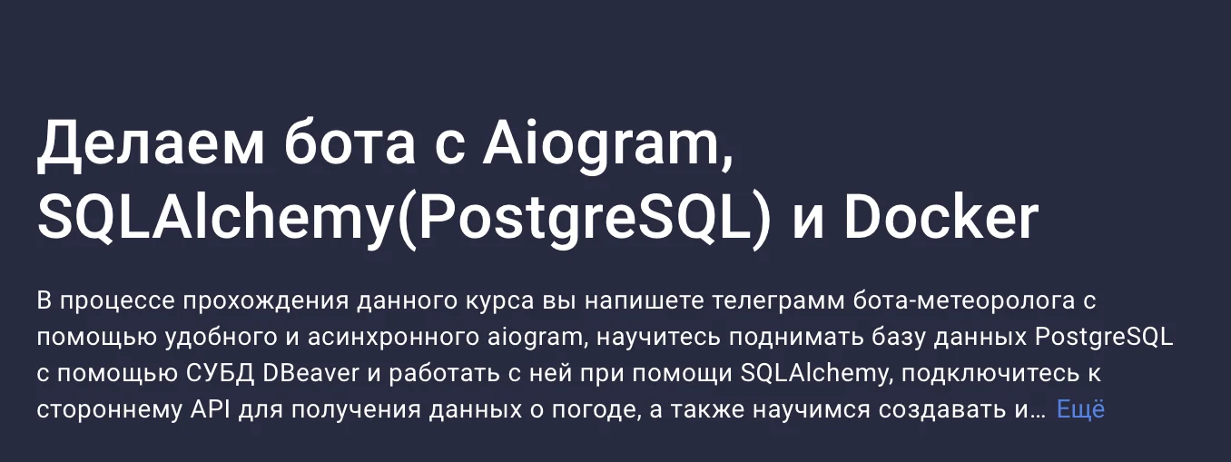 Курс предназначен для людей, которые уже овладели языком Python, понимают что-такое ООП, хотят написать свой проект, но постоянно спотыкаются о непонимание работы с документацией библиотек/фреймворков и отсутствие идей для своего проекта.