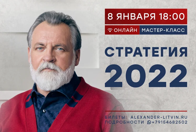 8 января 2022 года в 18:00 (время московское) в zoom состоится онлайн-сессия Александра Литвина "Стратегия 2022". Эксклюзивная информация от Александра Литвина поможет вам составить свой личный план с учетом ваших индивидуальных особенностей и биологических ритмов, сфокусироваться на главных целях и задачах, не идти на поводу у большинства и реализовать задуманное.