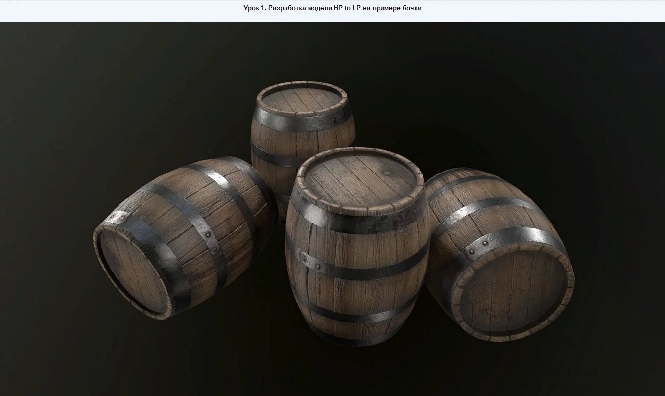 Студенты должны повторить бочку точно по референсу. При этом они учат несколько моментов: как делается древесина для игр, как следовать прямому пайплайну, как строить работу наперед, а также разницу ручного и процедурного текстуринга.