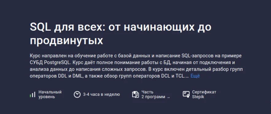 Курс даёт полное понимание работы с БД, начиная от подключения и анализа данных до написания сложных запросов.