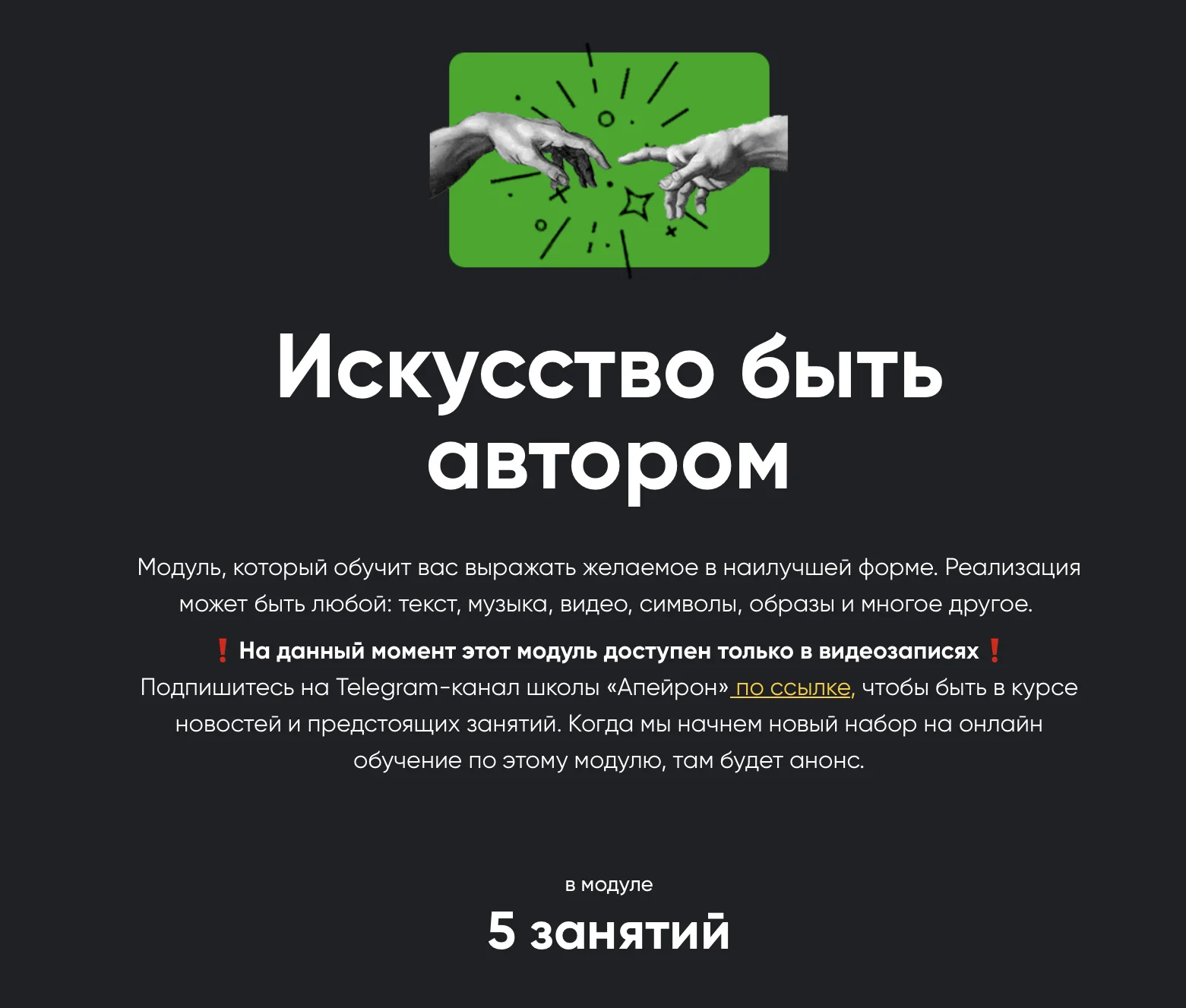 Чтобы вырваться за эти пределы, и этот рывок не стал бегством, а свободным творческим актом, необходимо совершить контркультурное действие: обнаружить коды-печати, хранящие данную культуру и сломать их в себе. Будем делать это вместе на новом модуле «Искусство быть автором». Изучим коды, кодирующие тексты, символы и изображения - три столпа культуры, изучим философско-психологическое обоснование кодирования, и научимся технике его обхода - в собственных целях.