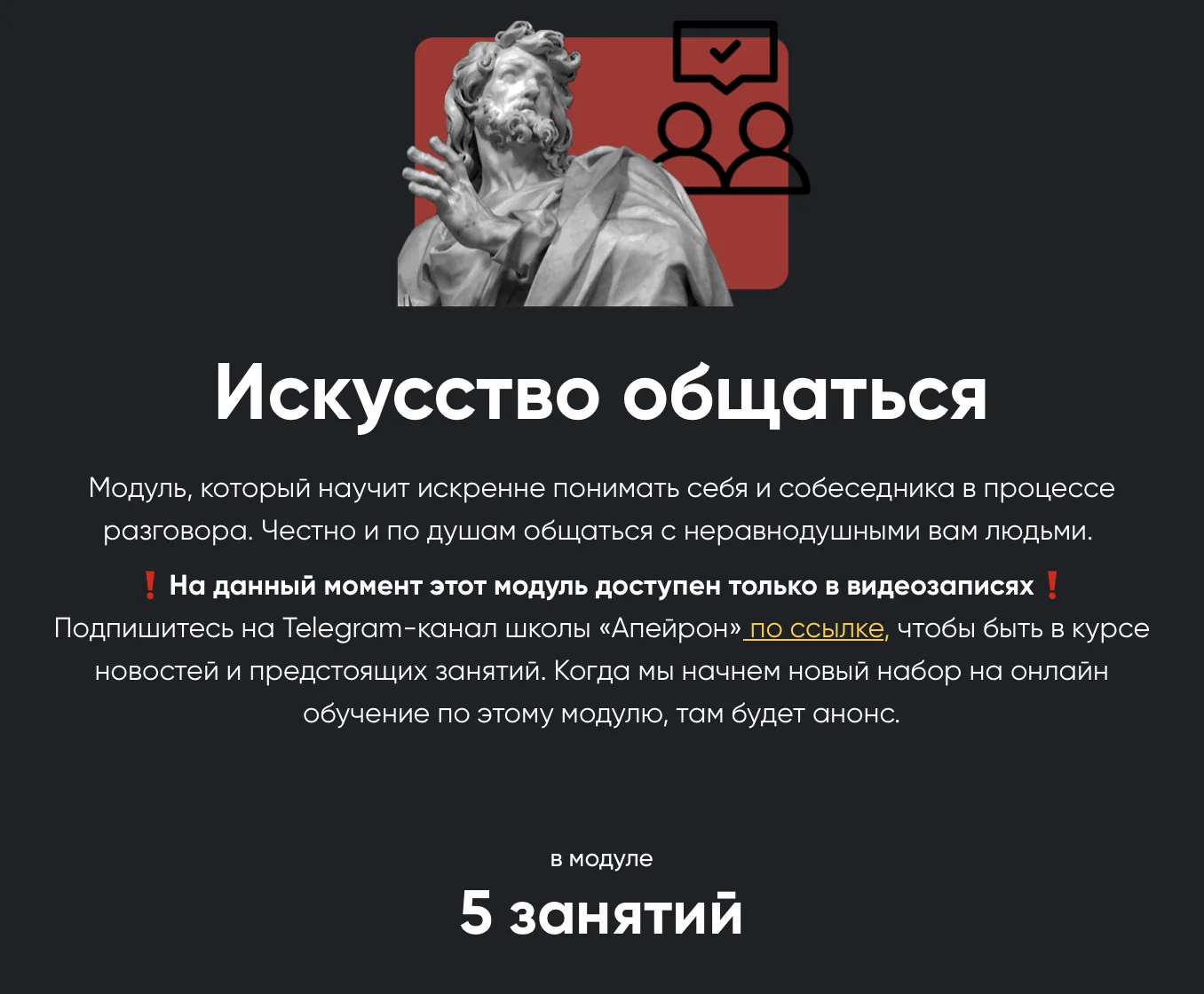 Модуль «Искусство общения» – это про зажигание друг друга как свеча от свечи, разговор по душам, который сам по себе очень сильно эволюционно поднимает и растит обоих людей.