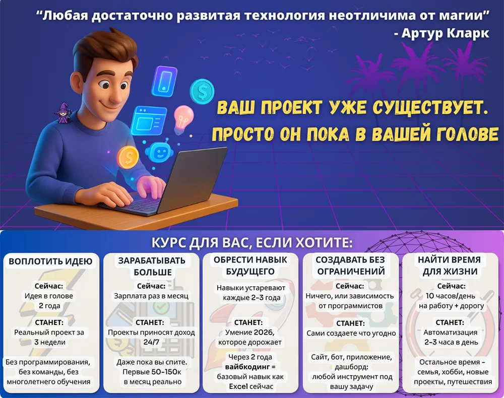 Вы начнёте мыслить на языке цифровых создателей – вайбкодеров, людей которые силой правильно выстроенной мысли создают целые системы.