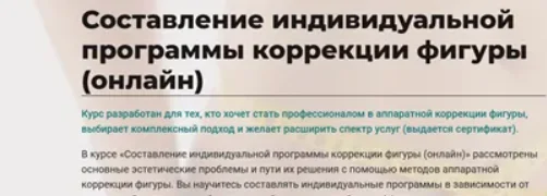 В курсе «Составление индивидуальной программы коррекции фигуры (онлайн)» рассмотрены основные эстетические проблемы и пути их решения с помощью методов аппаратной коррекции фигуры. Вы научитесь составлять индивидуальные программы в зависимости от конкретной ситуации, подбирать и комбинировать наиболее эффективные методы для достижения быстрого результата. Принять взвешенное решение о расширении спектра услуг в вашей студии.