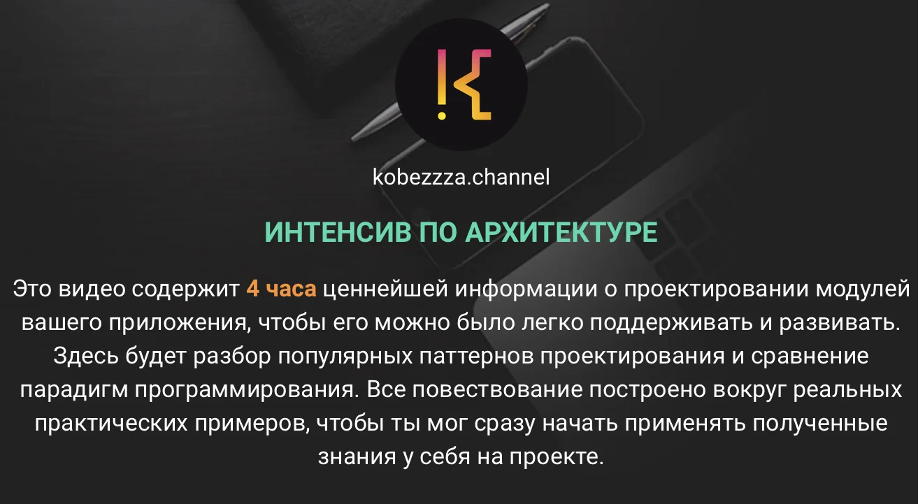 Это видео содержит 4 часа ценнейшей информации о проектировании модулей вашего приложения, чтобы его можно было легко поддерживать и развивать. Здесь будет разбор популярных паттернов проектирования и сравнение парадигм программирования. Все повествование построено вокруг реальных практических примеров, чтобы ты мог сразу начать применять полученные знания у себя на проекте.