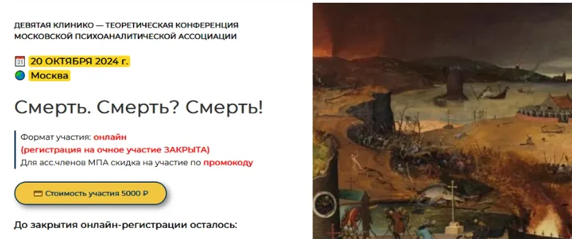 В рамках конференции мы с вами рассмотрим некоторые теоретические аспекты взаимодействия нашей психики с абсолютно абстрактной идеей смерти и попытаемся приблизить теоретические знания к данным клиники.