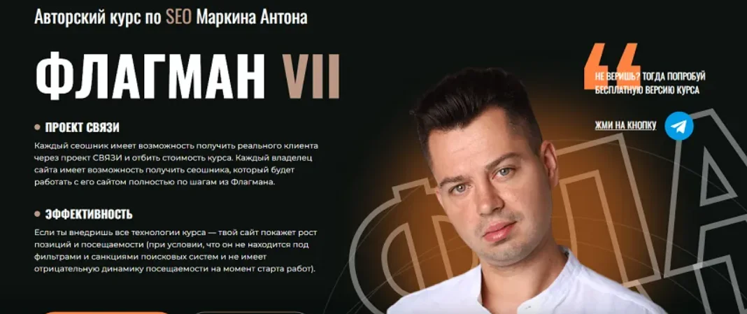 Мои курсы особенно ценны для тех, кто уже проходил другие курсы и разочаровался. "Флагман" учит не сказкам, а настоящему SEO основанному на практике с 2011 года, программа обучения от построения структуры сайта до взятия топа.