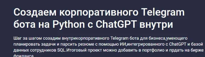Шаг за шагом созадим внутрикорпоративного Telegram бота для бизнеса,умеющего планировать задачи и парсить резюме с помощью ИИ,интегрированного с ChatGPT и базой данных сотрудников SQL.Итоговый проект можно добавить в портфолио и прдать на бирже фриланса.