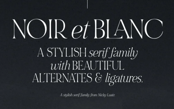 Как драматично сочетаются черное и белое - поприветствуйте "NOIR et BLANC" - стильное семейство засечек с красивыми лигатурами и чередованиями. Созданные для гармоничного использования, резкий контраст смелых и сладострастных заглавных букв обычного серифа прекрасно сочетается с изящными и знойными строчными буквами его курсивного аналога.