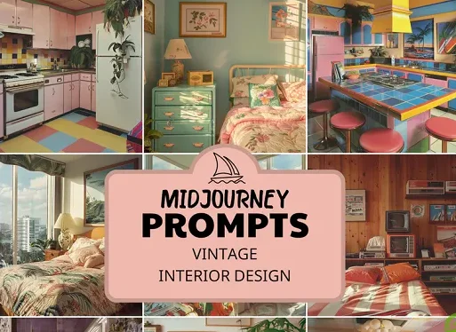 Midjourney Prompts for Vintage Interior Design, Retro 80s Design, 90s Design, Archviz, 3D Render - создайте неограниченный винтажный дизайн интерьера для вашего бизнеса, социальных сетей, POD продуктов и многого другого!
