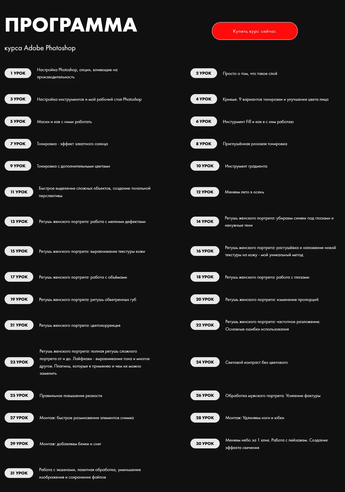 - Программа курса охватывает все аспекты, начиная с настроек, заканчивая самой обработкой