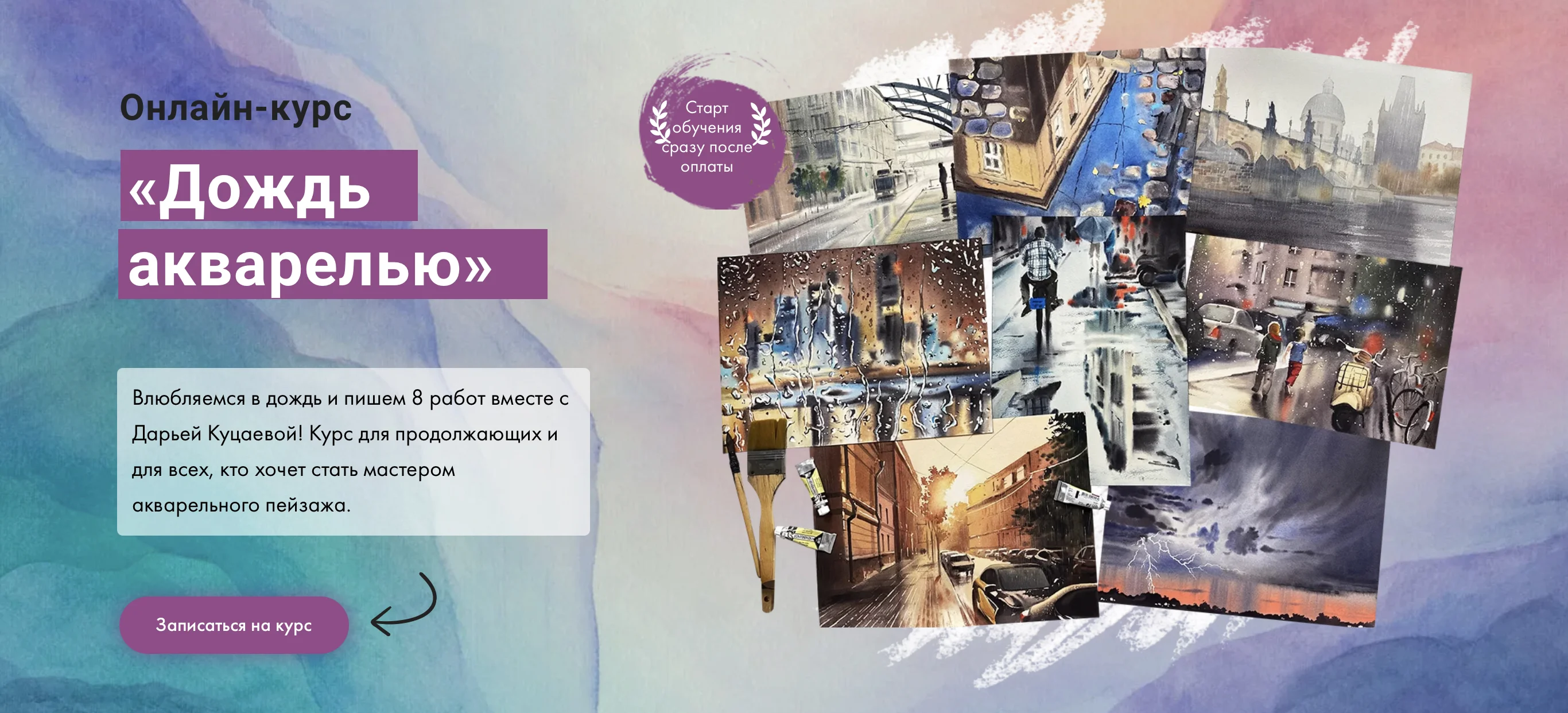 Любителям акварельной живописи, которые хотят выполнить нестандартные задания. Влюбитесь в дождь и напишите 8 удивительных работ вместе с Дарьей Куцаевой! Изучите физические свойства воды, с ее рефлексами и искажениями, поработайте над городскими пейзажами и научитесь показывать разные состояния природы.