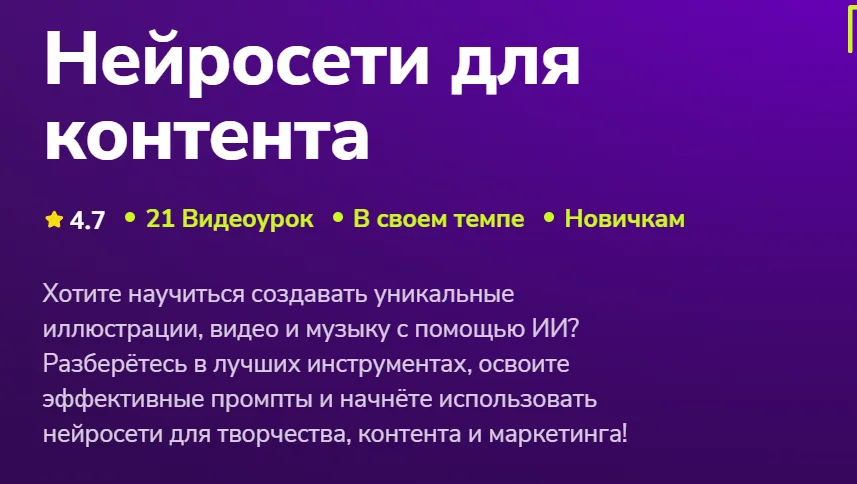 Хотите научиться создавать уникальные иллюстрации, видео и музыку с помощью ИИ? Разберётесь в лучших инструментах, освоите эффективные промпты и начнёте использовать нейросети для творчества, контента и маркетинга!