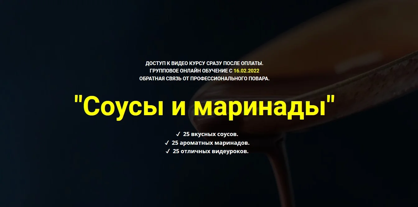 - Вы забудете про пресные блюда, у которых нет правильного баланса вкуса и аромата, потому что на это этом курсе научитесь всему тому, что нужно знать для приготовления вкусных соусов!