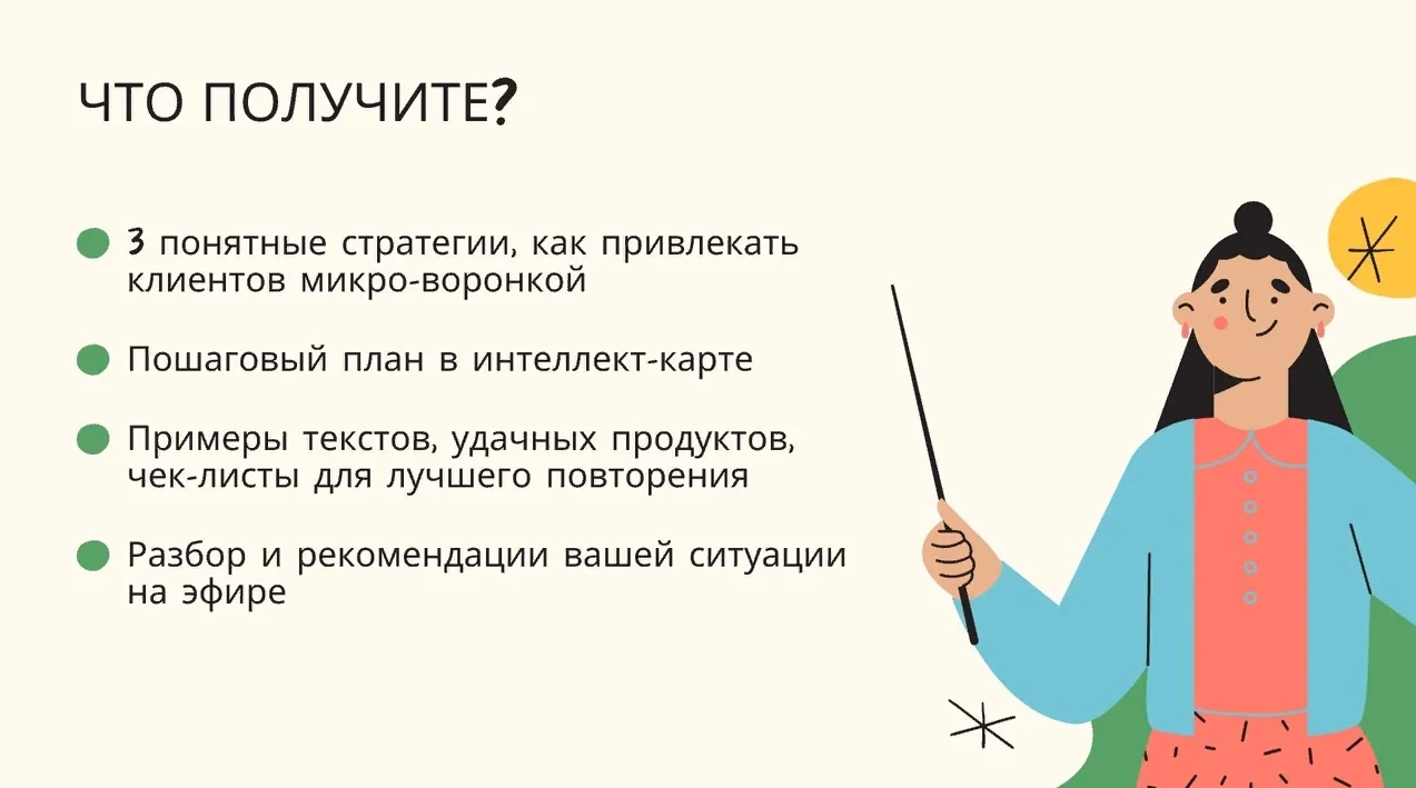 ★ ИДЕЯ. Здесь мы проработаем с вами вашу главную идею микро-воронки, с которой будут идти клиенты. Вы перестанете быть унылым персонажем, а по моим примерам создадите КРУТУЮ манящую идею, на которую ваша ЦА будет лететь, как жирные пчелки на мед.