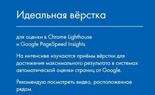 На интенсиве изучаются приёмы вёрстки для достижения максимального результата в системах автоматической оценки страниц от Google. Ведь при ранжировании Google официально учитывает показатели Core Web Vitals