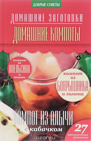 Традиционные способы заготовок по старым добрым и умным рецептам возвращают к атмосфере приятных домашних хлопот и обещают необыкновенное вкусовое разнообразие. Приготовленные вкусности будут радовать каждый день и напомнят о многоцветье урожая. 27 проверенных рецептов: компот из апельсина и тыквы, компот из боярышника и лимона, компот из алычи с кабачком, и др.