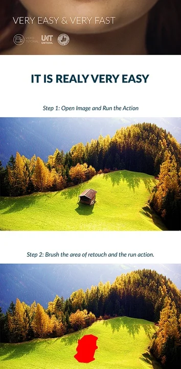 Это фотошоп действие предназначено, чтобы помочь фотографу и дизайнеру. Легко устранить дефекты изображений, таких как грязи, царапин, ран, прыщей, избыточных объектов и нежелательных надписей и других артефактов.