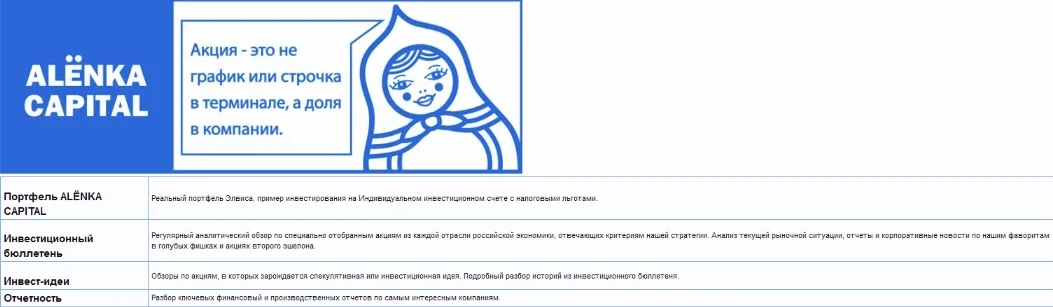 ALЁNKA CAPITAL впервые появилась в соцсети "ВКонтакте" в октябре 2013 года, как портфель акций от Элвиса Марламова, после выхода известной статьи «Алёнка и Сникерс». Это альтернативный подход к инвестированию на российском фондовом рынке, основанный на реальных фундаментальных показателях конкретных российских компаний, сделок M&A и здравом смысле, в противовес к повальному увлечению внешней макроэкономикой. Алёнка объединяет тех, кто считает, что акция - это доля в бизнесе, а не инструмент для биржевой игры. Очень важно, что в Алёнке не нервничают на спадах, коих было не мало в кризисных 2014-2015, а пользуются такими моментами для наращивания портфеля.