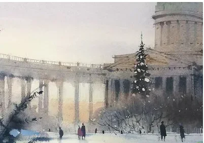 Урок 2. Попробуем передать ощущения воздуха и морозного утра в городе с помощью нескольких акварельных приемов. Сместим акцент с архитектуры на отношения пятен цвета и тона.