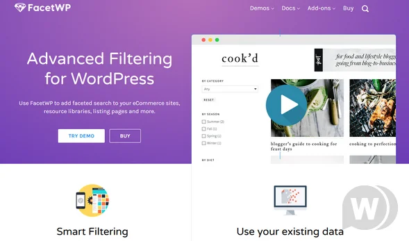 Высококачественный инструмент для WordPress, который позволяет добавлять персонализированный поиск на страницы сайтов электронной коммерции, библиотеки ресурсов и многое другое. Он поставляется с настройками, в которых отображаются только значения аспекта. WordPress плагин FacetWP поставляется с 11 предопределенными типами поиска, в том числе раскрывающиеся списки, диапазоны дат, чекбоксы, ползунки, и даже близость по геолокации.