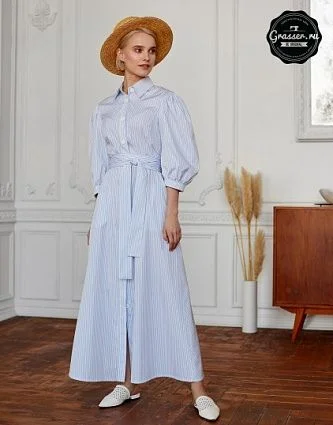 Платье приталенное, отрезное по линии талии, длиной до щиколотки. Перед с рельефами, выходящими из среза проймы до среза талии (рельеф смещен относительно выступающей точки грудной железы), с притачными планками с застежкой на 10 обметанных петель и пуговиц. Спинка с плечевыми вытачками. В боковых швах расположены карманы. По срезам талии платье собрано на легкую сборку при помощи эластичной тесьмы. Рукава объемные - «фонарик», втачные, одношовные, длиной до линии локтя, по срезам оката и низу рукава сборка, низ обработан притачной манжетой с застежкой на 1 обметанную петлю и пуговицу. Воротник стояче-отложной с отрезной стойкой с застежкой на 1 обметанную петлю и пуговицу. Модель дополнена съемным поясом.