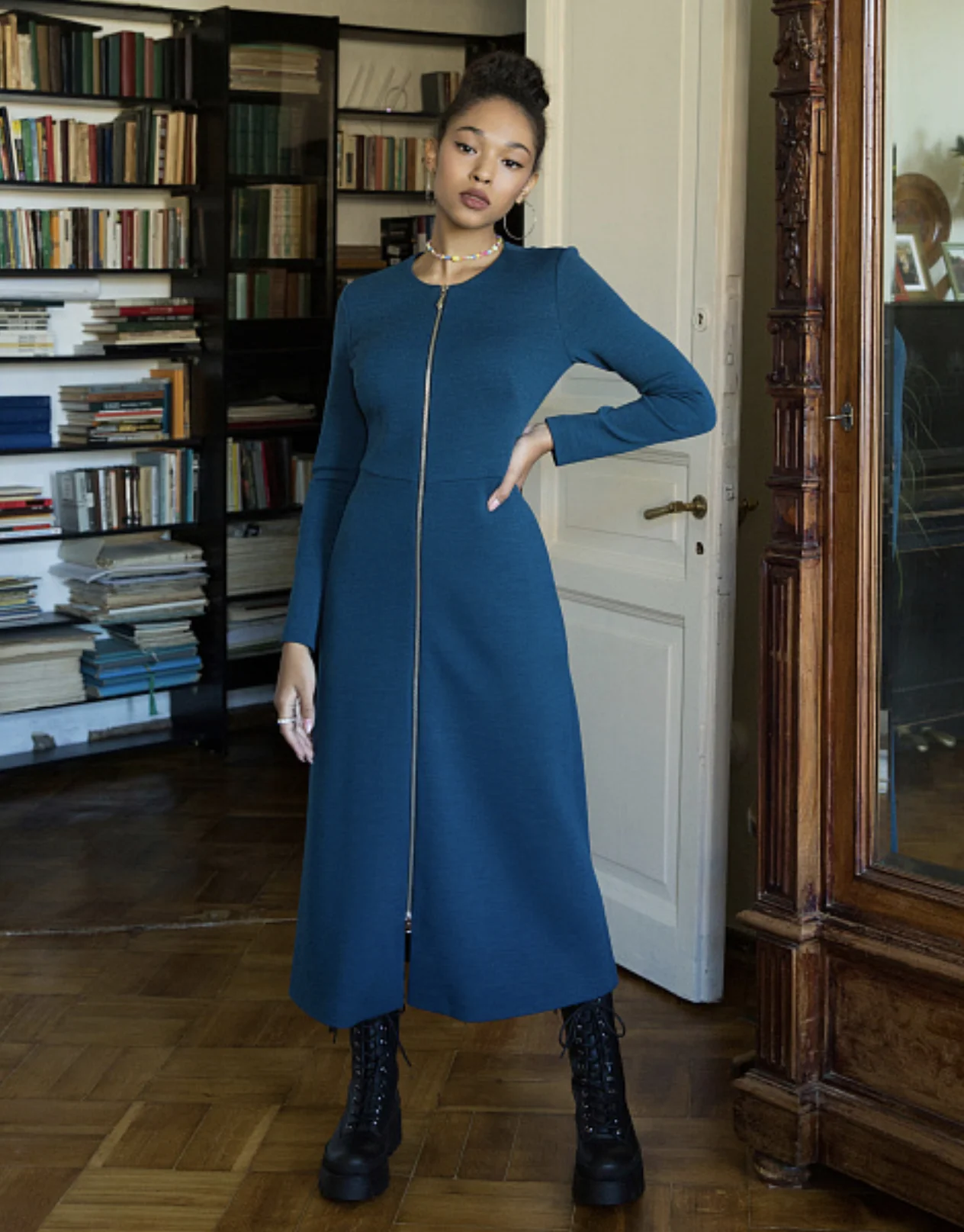 Рукав втачной длиной до запястья. Горловина обработана обтачкой и подбортом. Центральная застежка на молнию спереди.