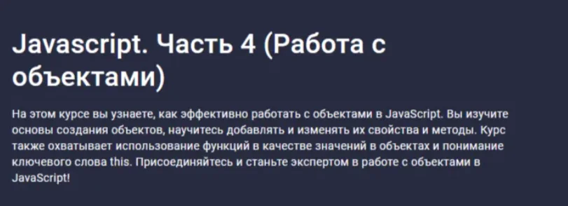 - После успешного освоения курса вы научитесь создавать и использовать объекты в JavaScript, определяя их как структуры данных ключ-значение и манипулируя массивами объектов. Вы сможете применять цикл for...in для перебора свойств объектов и использовать методы объекта Object для работы с ключами и значениями. Вы также освоите преобразование объектов в формат JSON и обратно.