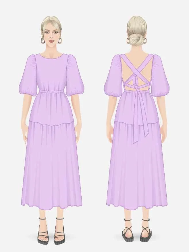 Платье длинное, расклешенное к низу, отрезное по линии талии. Горловина лифа по передней части овальной формы, на открытой спинке оформлена двумя перекрещенными завязками банта. Рукава объемные, со сборкой и эластичной лентой по окату, нижнему срезу. Нижняя часть платья двухъярусная с широкой оборкой. На притачном поясе по линии талии обработана кулиса с широкой эластичной лентой. Нижний срез застрочен швом вподгибку с закрытым срезом.