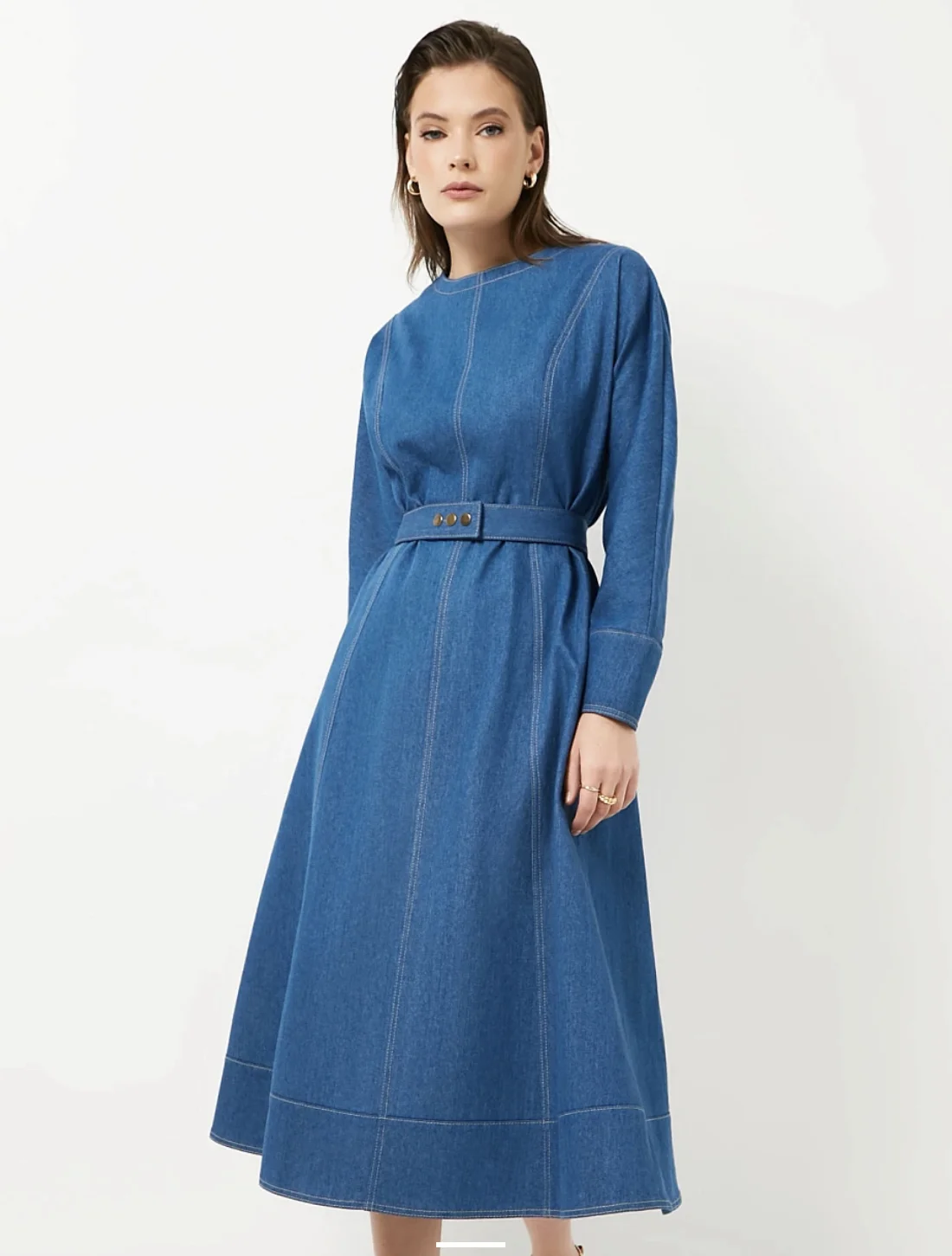 Платье сшито из ткани костюмной джинсовой ткани, состав хлопок 100%, плотность 330 гр/м².
