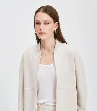 Толстовка среднего объема прямого силуэта с центральной застежкой на тесьму-молнию с притачными поясом и воротником-стойкой. Перед и спинка с горизонтальным подрезом. Рукав спущенный одношовный длинный с притачной манжетой. По манжетам, поясу, воротнику, горизонтальным подрезам, проймам и вдоль молнии отделочная строчка. Свитшот сшит из футера трехниточного с начесом, состав 80% хлопок, 20% полиэстер, плотность 320 гр/м².