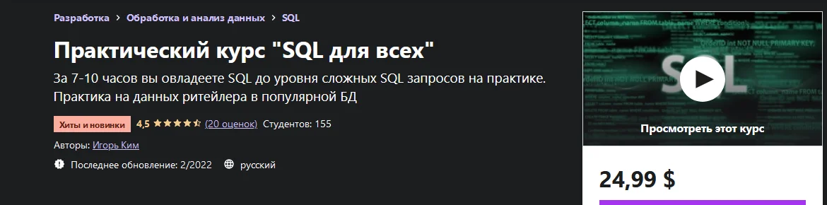 За 7-10 часов вы овладеете SQL до уровня сложных SQL запросов на практике. Практика на данных ритейлера в популярной БД