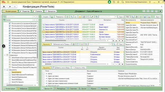 • Отбор объектов по части наименования, имени и типа реквизита в дереве конфигурации.