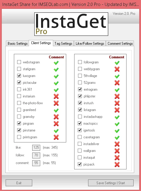 Instaget pro — многофункциональный софт для облегчения работы с инстаграмом. Очень удобная программа, много что умеет, например писать комментарии в ограниченном количестве, подписываться на чужие страницы, накручивать лайки в instagram и многое другое. Безопасность аккаунта от блокировок обеспечивается постоянной сменой юзер агентов (название и версии браузера с которых работает бот) на данный момент имеется 11 браузеров.