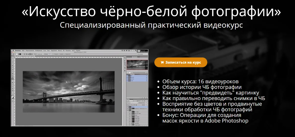 Вы познакомитесь с историей ЧБ фотографии и научитесь видеть картинку. Вы узнаете, как правильно переводить снимки в ЧБ, как подчеркнуть главное в кадре и добиться нужного эффекта при обработке, а также многое другое.