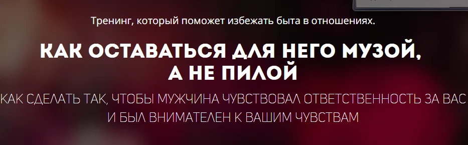 Мой курс "Как оставаться для него музой, а не пилой" продемонстрирует вам массу примеров и женских секретов. Это поможет не только правильно общаться со своим мужчиной в любых ситуациях, но и сохранять при этом чувство собственного достоинства.