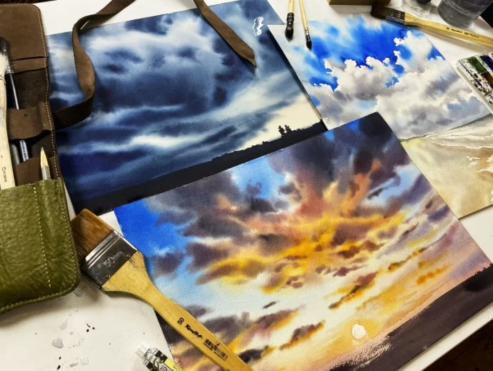 Вместе с Дарьей Куцаевой вы напишете небо в трех состояниях: белые кучевые облака в солнечный день, красочный закат и грозовые тучи. Все пейзажи будут выполнены в технике по-мокрому, поэтому для прохождения мини-курса вам обязательно понадобится бумага с хлопком в составе. Курс подойдет как новичкам в акварельной живописи, так и продолжающим, тем, кто хочет глубже погрузиться в тему пейзажа.