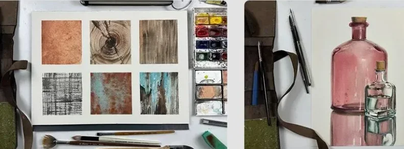 Дарья Куцаева создала интересный курс для акварелистов, посвященный изображению разнообразных текстур и фактур. Преподаватель подобрала референсы, ориентируясь на запросы учеников. На курсе вы узнаете, как с помощью акварели передать блеск шелка, матовость бархата, прозрачность стекла, сияние меди, фактуру состаренной кожи, древесины, драгоценных камней и многое другое.