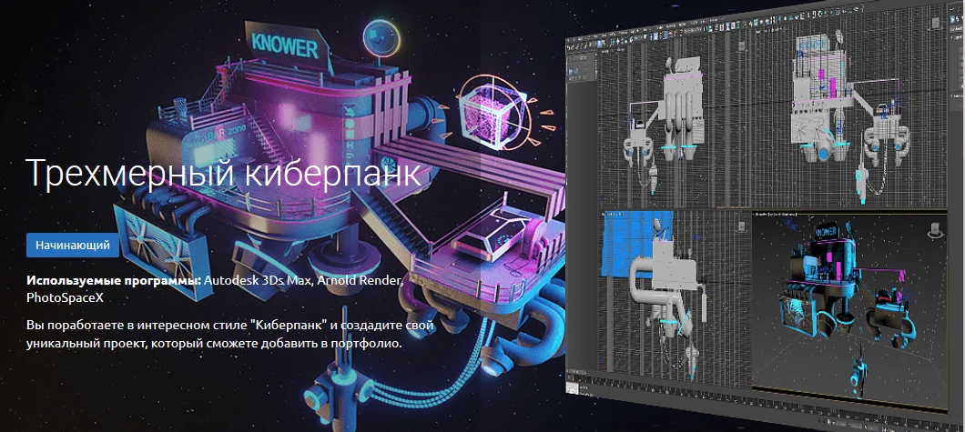 Работать с Arnold Render, добавлять эффекты дыма, голограмм, и неона. А также сделаете финальную визуализацию в стиле киберпанк!