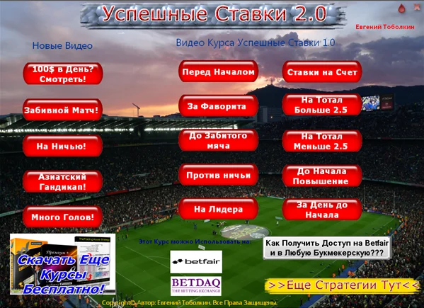 Короче говоря, качайте бесплатный курс Успешные Ставки 2.0 себе на комп. Смотрите его "от" и "до" и впитывайте все нюансы и фишки от (не побоюсь этого слова