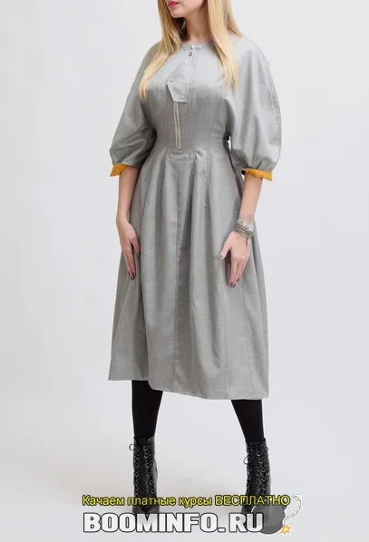 Выкройка платья из плотной ткани. Платье женское объемное в плечевом поясе и юбке, но плотно прилегающее в области талии, длиной до середины голени, на подкладке (притачной или отлетной). Перед и спинка со средними швами, с цельнокроеным рукавом с отрезной ластовицей нижней части рукава. На каждой детали (перед*2 и спинка*2) по 3 вытачки по низу юбки, по 3 вытачки по низу рукава, по 2 глубоких талиевых вытачки. На переде центральная притачная планка с молнией длиной 35-40 см, с настрочным декоративным клапаном с кнопкой и 4 декоративными кнопками (хольнитенами) в углах планки. Отделочные строчки проложены по всем вытачкам, верхним швам рукава, краю планки, клапану, шву притачивания ластовицы.