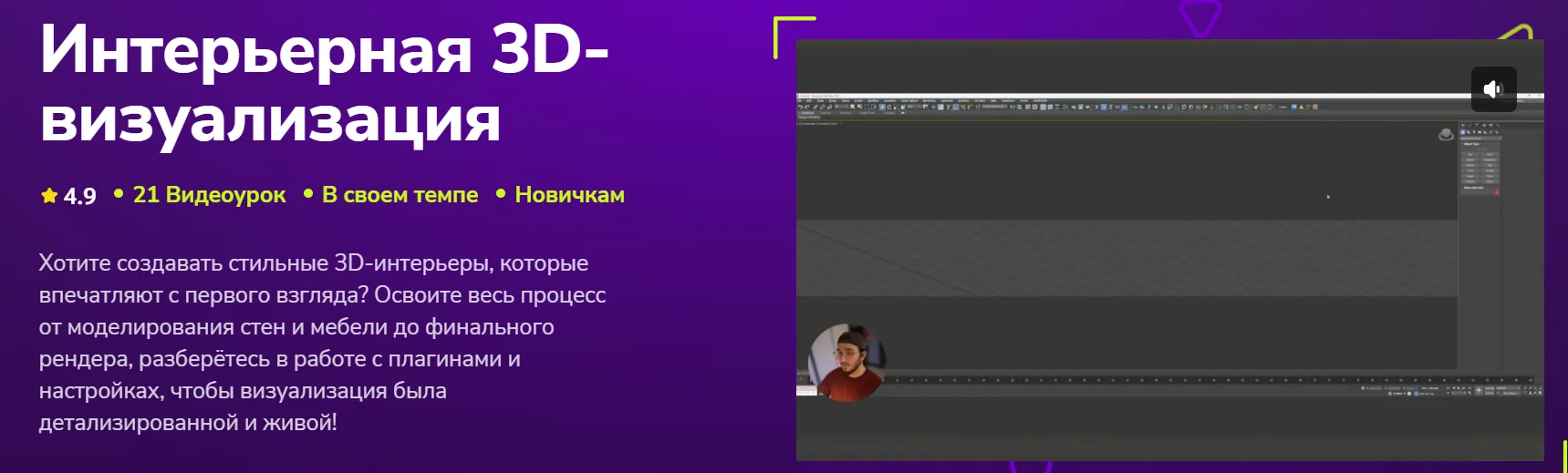 Освоите весь процесс от моделирования стен и мебели до финального рендера, разберётесь в работе с плагинами и настройках, чтобы визуализация была детализированной и живой!