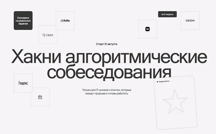 - Собрали задачки, которые встречались соискателям на собеседованиях в Яндекс, VK, Ozon, Сбер, Авито, Huawei и другие компании. Мы включили их в лекции и домашку, поэтому уже на первой неделе ты будешь готов к алго-собесу в Авито, на второй в OZON и так далее