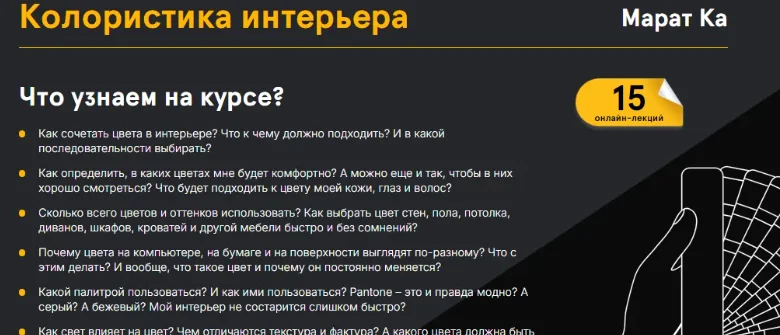 Есть! Неподражаемый Марат Ка научит вас видеть, подбирать и сочетать цвета, пользоваться палитрами, составлять колористическую карту человека и интерьера!