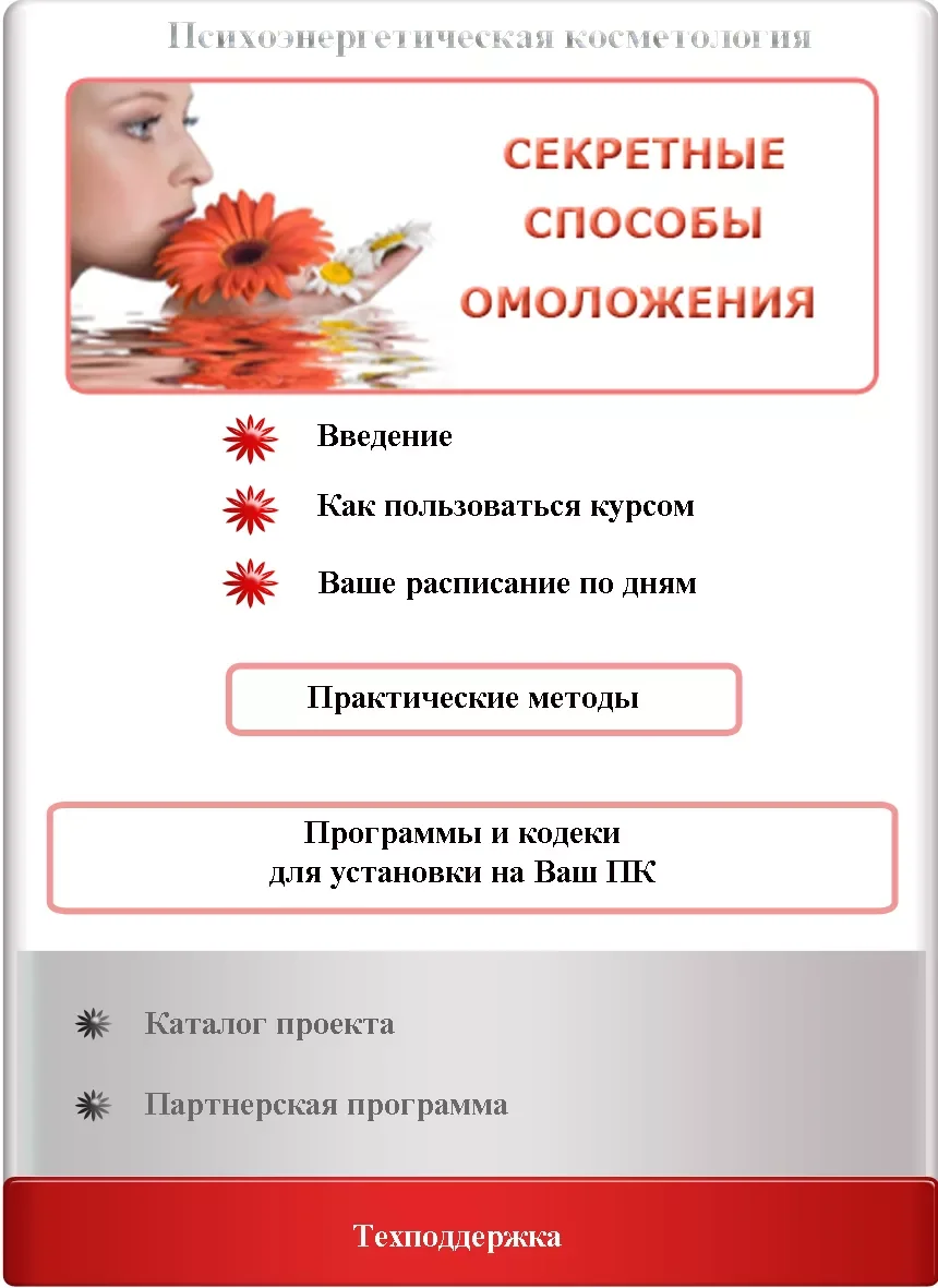 Курс «Секретные способы омоложения» - это лаконичное программное решение с очень удобной навигацией и строго выверенным сценарием практических шагов.