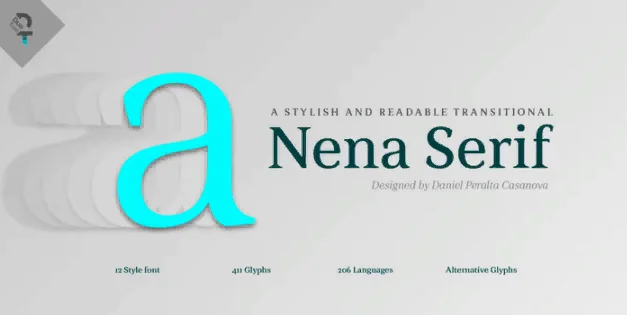 Шрифт Nena Serif доступен в 6 вариантах веса, от легкого до тяжелого, с соответствующим курсивом и альтернативными глифами. Шрифт содержит набор символов из 411 знаков, поддерживающих 206 различных языков.